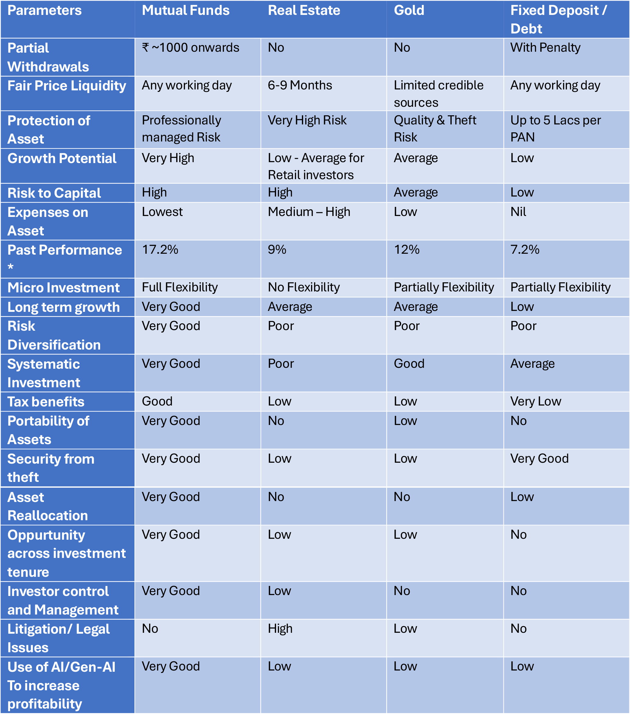 Below is the perspective of Mutual funds we derived from our Analysis compared with similar asset classes like Real estate, Gold, Fixed deposits and Equity trading